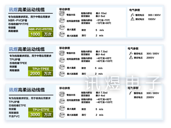 訊煜電子的高柔運(yùn)動(dòng)線纜按“運(yùn)動(dòng)次數(shù)”可分為: 1000萬次、2000萬次和 3000萬次3大類。