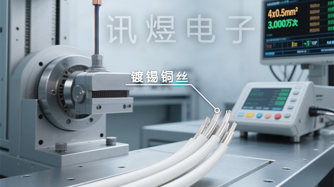 訊煜高柔運(yùn)動(dòng)線纜、潔凈線纜、真空線纜,這些線纜能彎折2000~3000萬次不斷芯、穩(wěn)定運(yùn)行,核心就在線纜內(nèi)部那一根根多股精細(xì)抗氧化鍍錫銅絲。比如:4x0.5 mm2、 3000萬次的高柔運(yùn)動(dòng)線纜,要用到4根截面積為0.5 mm2的單芯線,每根芯線導(dǎo)體選用的是抗氧化鍍錫銅(鍍錫銅更耐用、更柔軟、耐腐蝕性、抗氧化及信號(hào)傳導(dǎo)性更強(qiáng))。 先把14根直徑0.08mm的細(xì)銅絲合絞為一組,然后再用7組合絞后的銅絲進(jìn)行復(fù)絞,相當(dāng)于把98根超細(xì)銅絲像麻花辮一樣緊密交織。 復(fù)絞結(jié)構(gòu)不僅讓芯線更加牢固,也讓銅絲間的應(yīng)力均勻分散,即使經(jīng)過數(shù)千萬次彎折,銅絲的導(dǎo)電性能依舊穩(wěn)定可靠!